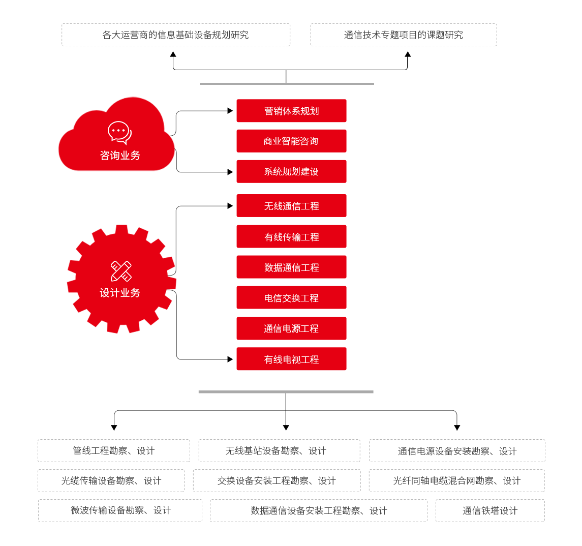 為客戶提供通信網(wǎng)、計算機網(wǎng)、廣播電視網(wǎng)等網(wǎng)絡(luò)的設(shè)計咨詢服務(wù);為通信企業(yè)提供綜合發(fā)展規(guī)劃、戰(zhàn)略規(guī)劃 專題規(guī)劃、業(yè)務(wù)咨詢及管理咨詢等咨詢服務(wù)。公司擁有工程設(shè)計、工程勘察等國內(nèi)通信設(shè)計領(lǐng)域的頂級資質(zhì);優(yōu)質(zhì)的服務(wù)質(zhì)量,快速的業(yè)務(wù)響應(yīng)能力、標準化、規(guī)范化的服務(wù)流程以及優(yōu)秀的工程設(shè)計項目質(zhì)量為公司在業(yè)界取得良好的口碑。